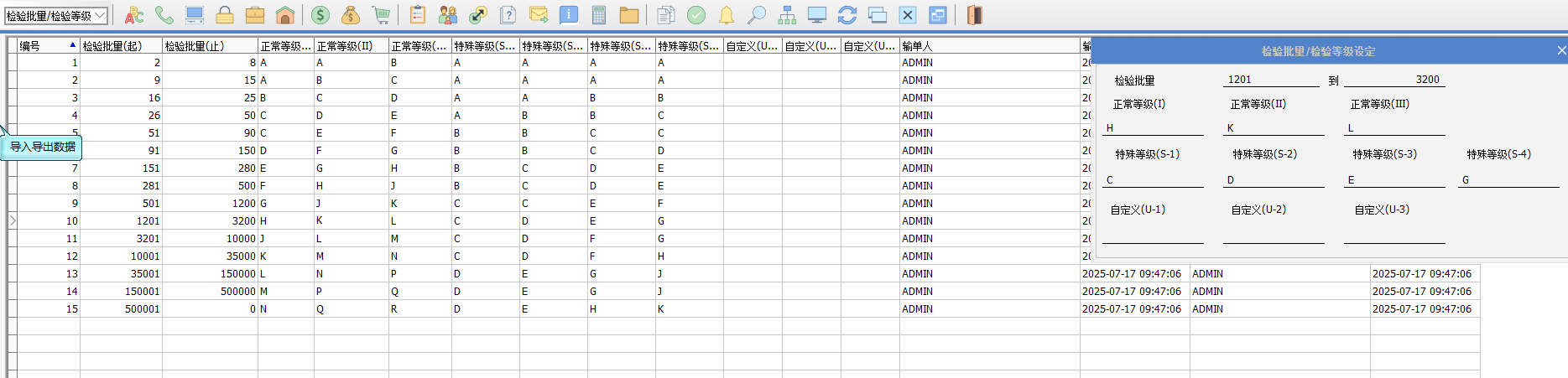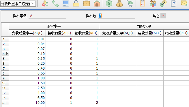 2. 允許質(zhì)量水平設定:點擊缺省,將載入最新的標準檔數(shù)據(jù)。 原來做法:允許質(zhì)量水平(AQL)對應的接收數(shù)量(ACC)和拒收數(shù)量(REJ)是一一對應的數(shù)值。