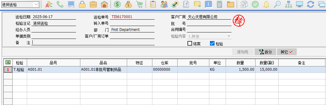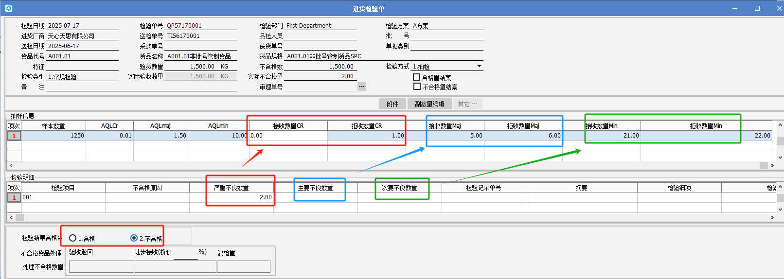 注意:當送檢量小于樣品數(shù)量,進貨送檢單的樣本數(shù)量就取送檢量,若大于樣本數(shù)量,就取樣品數(shù)量。 E、再錄入檢驗明細的不良數(shù)量,即可判定檢驗結果是否合格。根據(jù)下圖的不良數(shù)量對應接收數(shù)量和拒收數(shù)量范圍來判定是否合格。最后單據(jù)保存即可。