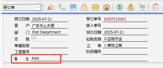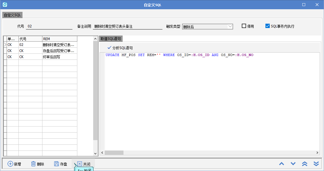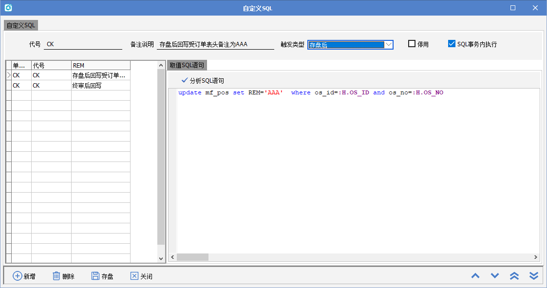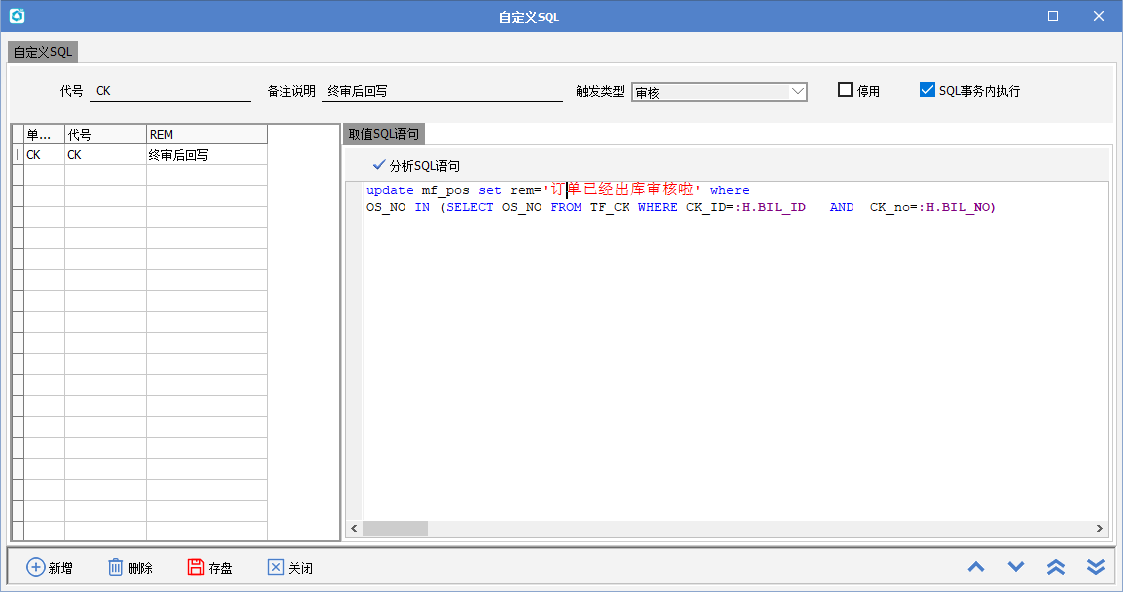 3. 舉例說明 范例1、設置出庫單存盤后,回寫轉入單號受訂單表頭的備注為AAA。在自定義SQL窗口,觸發類型選擇存盤后,寫入下圖中的SQL語句即可。