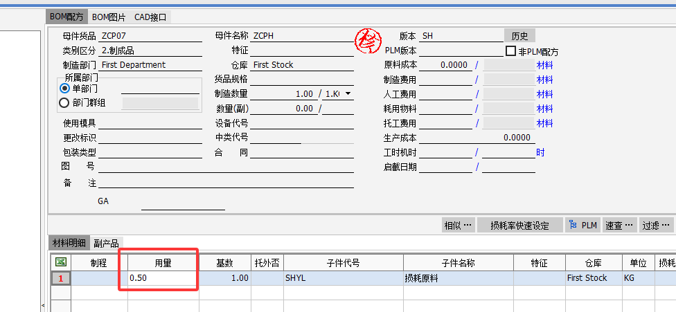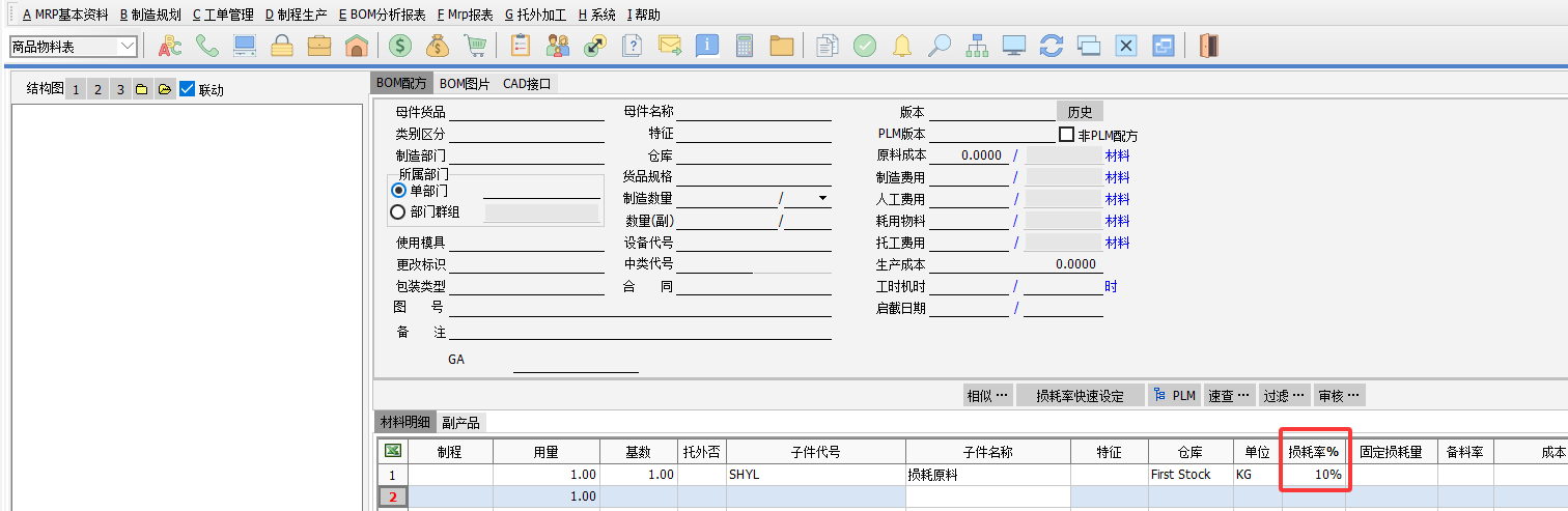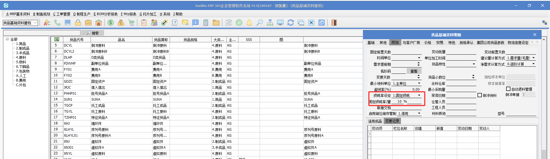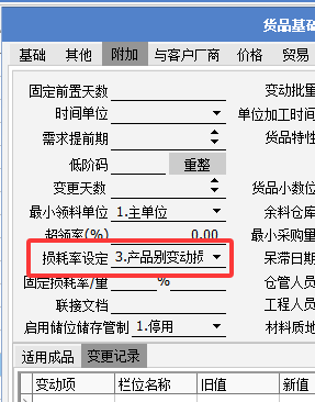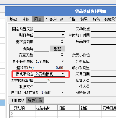 一、料件的損耗率設置 1.固定損耗 貨品資料設置固定損耗率或固定損耗量,商品物料表選擇對應料件的時候會帶出對應的固定損耗率或損耗量; (1)固定損耗率