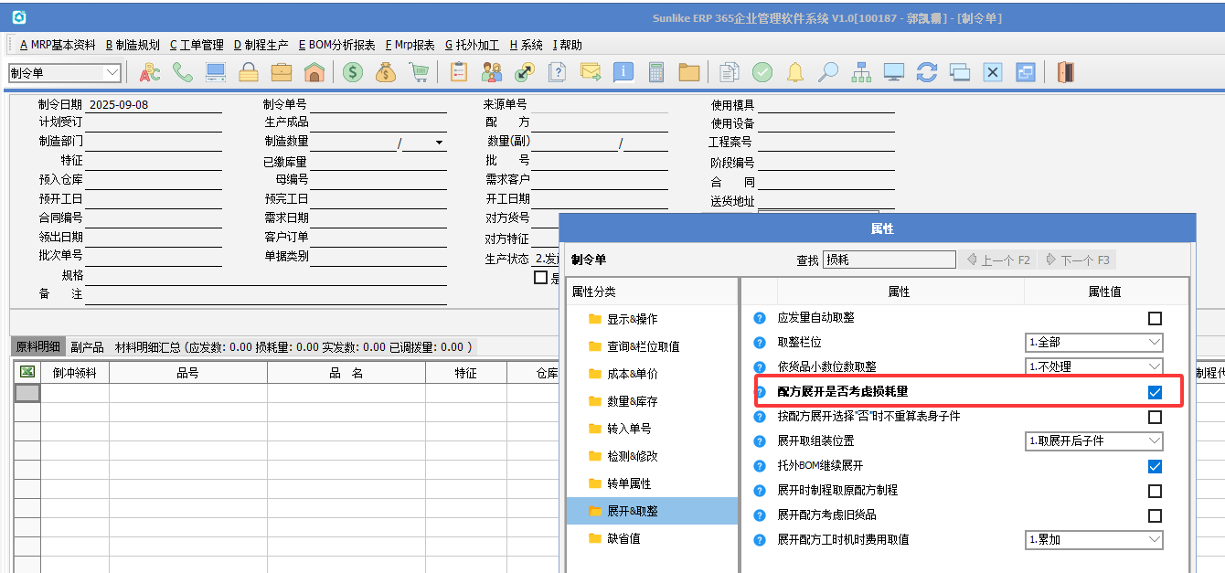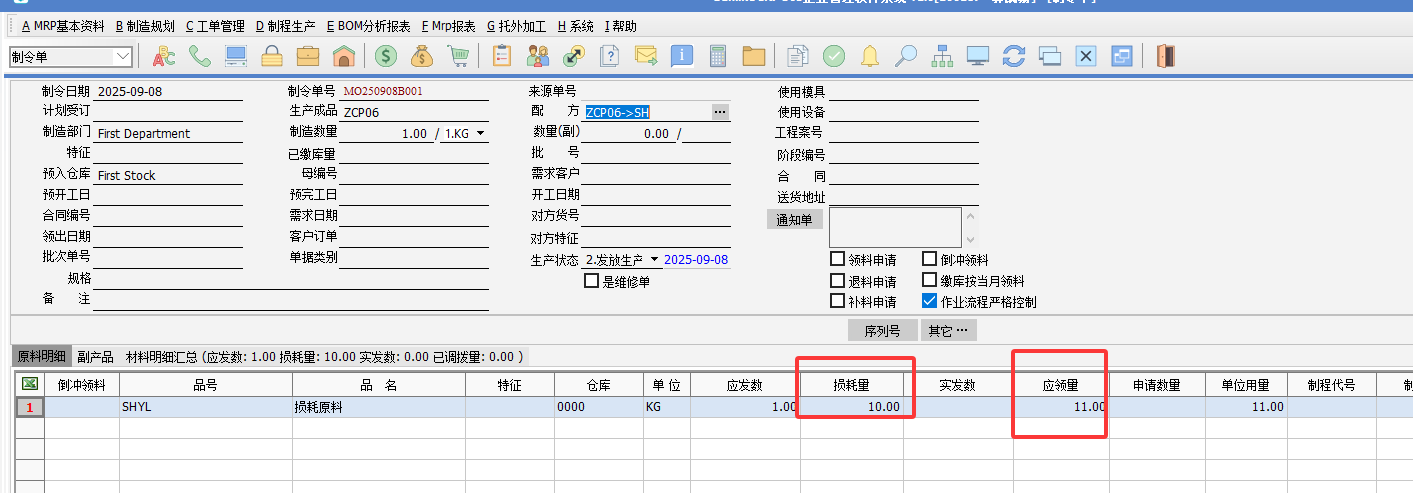 舉例說明: 依據固定損耗--制令單 生產單據勾選屬性“配方展開是否考慮損耗量”,系統會取BOM設置的固定損耗量或損耗率進行計算生產單據的損耗量和應領量;