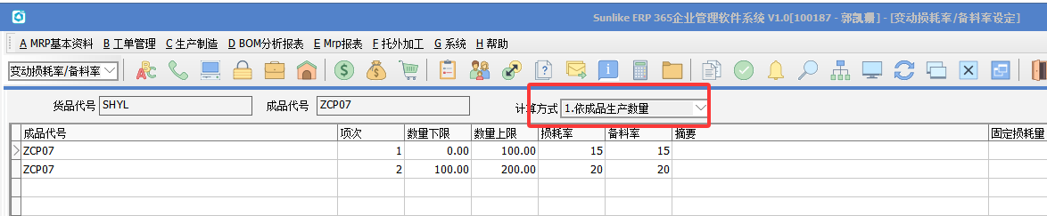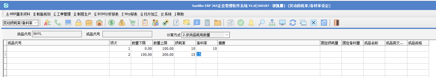 2.變動損耗設置 路徑:MRP系統->MRP基本資料->損耗率/備料率設定->損耗率/備料率設定) (1)按貨品耗用數量(可以按料件使用的數量區間設置不同的損耗率和備料率)