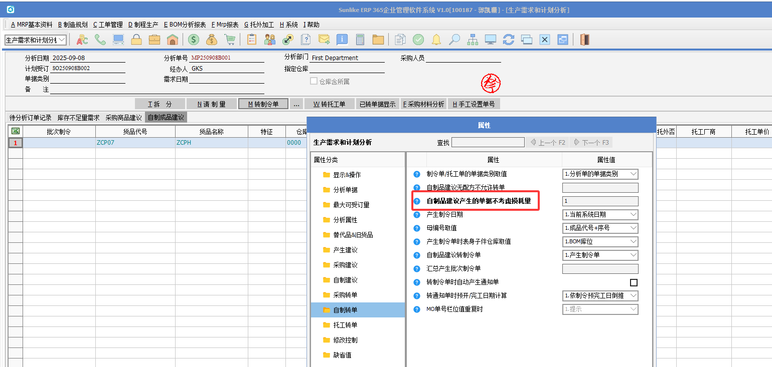 舉例說明: 依據變動損耗(按貨品耗用數量)--生產需求分析 生產需求分析料件的采購的備料是根據損耗率設置的備料率進行計算的,根據屬性“自制品建議產生的單據不考虛損耗量”確定轉生產單據表身材料是否要計算損耗; SHYL的標準用量是100,符合損耗率設置項次1,所以損耗量為100*10%=10個;