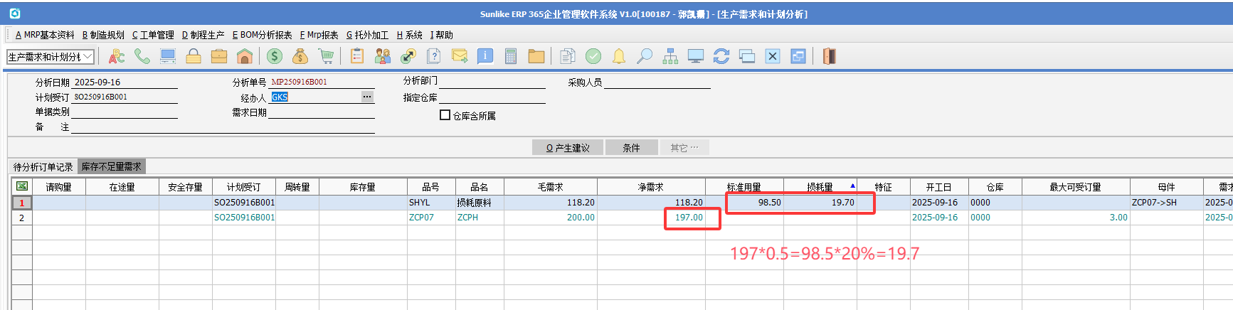 3.舉例說明依據產品別變動損耗(按貨品耗用數量)--生產需求分析 生產需求分析料件的采購的備料是根據損耗率設置的備料率進行計算的,根據屬性“自制品建議產生的單據不考虛損耗量”確定轉生產單據表身材料是否要計算損耗; 生產需求分析成品的凈需求是197,在變動損耗率設置里面符合項次2的數量區間,所以先計算出料件的需求量是197*0.5=98.5,再根據對應的區間取到損耗率20%,98.5*20%=19.7,所以總的毛需求數量為98.5+19.7=118.2;