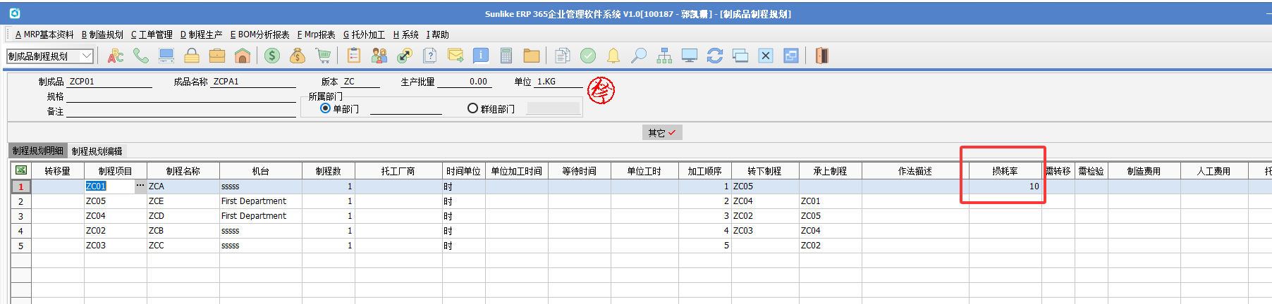 二、制程的損耗率設置 損耗率:制程生產過程中被損耗的數量,此道制程需要多生產的數量,只影響生產通知單表頭的制造數量
