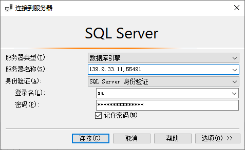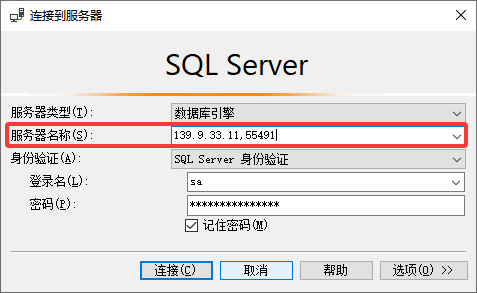 1.2、驗收數據庫端口是否連接成功 在SQL Server企業管理器中測試139.9.33.11,55491是否可以連接成功。也可以用云主機內網的IP+“,55491”進行測試。